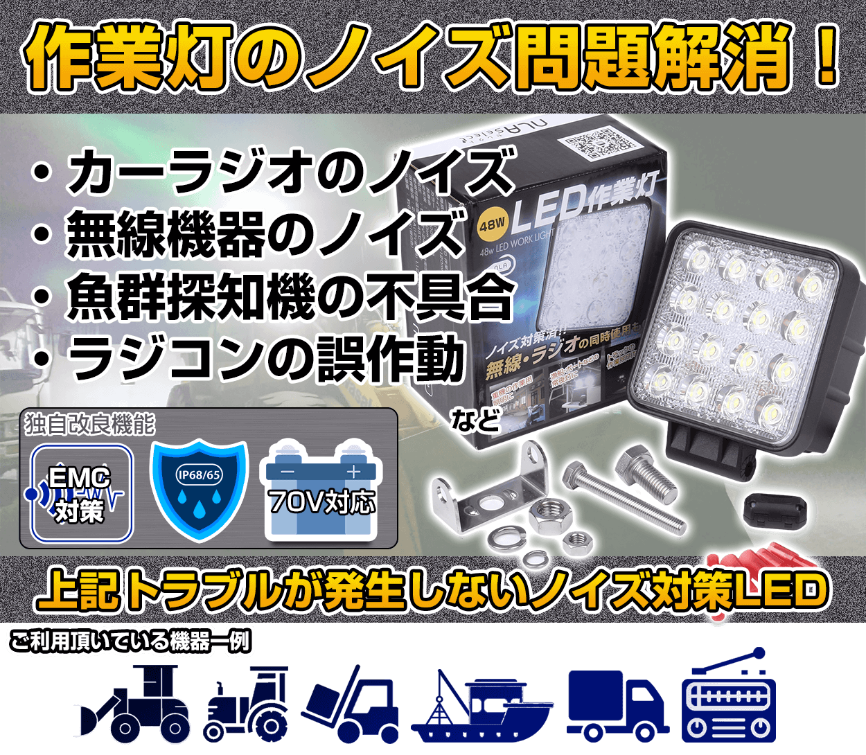 以前使用していた他社メーカーの作業灯は、ノイズで全くラジオが聴けませんでしたが今回購入の商品はラジオ等問題なく聴けました。非常に満足です。追加で購入して他の重機にも取付けしました。